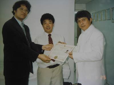 1990年边乾晋大师获中医硕土学位,医学院院长黄志伟及导师楊中海教授向边乾晋颁发毕业证书
